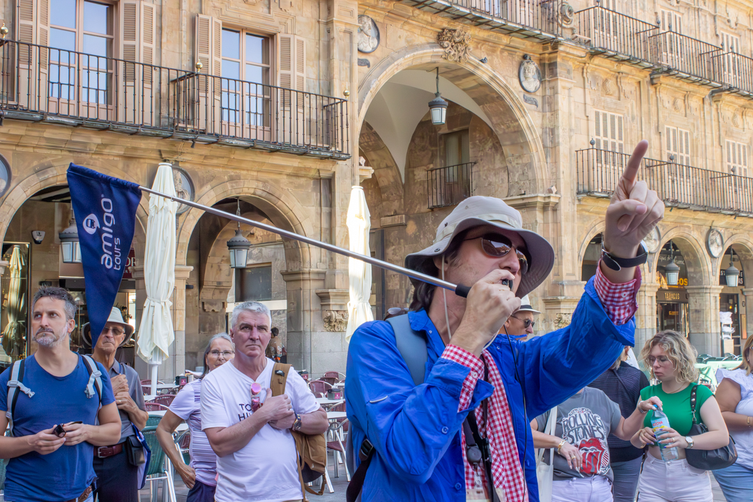 You will see the city's Plaza Mayor, with the clock tower in the background and meeting places for Salamancans in front of it. This public square, built in the 18th century, is one of Salamanca's most famous exponents of the traditional Spanish Baroque style. Today, it is an important place of meeting and public life in the city.